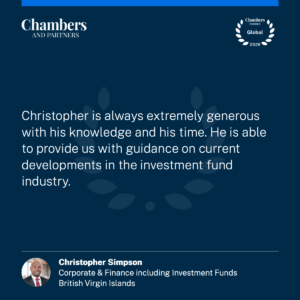 Christopher Simpson is head partner in the firm’s Commercial Department. His practice focuses primarily on corporate and commercial, banking and finance, and investment funds, where he advises a client base of leading financial institutions, corporations, and law firms on all aspects of corporate finance including joint ventures, initial public offerings, private placements, mergers, arrangements, corporate restructuring, bilateral and syndicated loans, bond issues, property financing, project finance, special purpose vehicles, investment funds, including crypto funds, and general aspects of corporate law. He also advises on investment business and regulatory matters, including fin tech and digital assets.