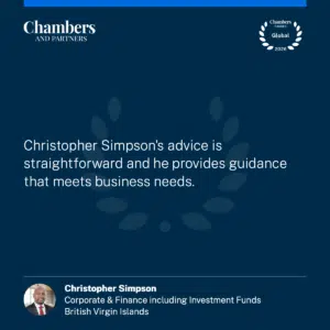 Christopher Simpson is head partner in the firm’s Commercial Department. His practice focuses primarily on corporate and commercial, banking and finance, and investment funds, where he advises a client base of leading financial institutions, corporations, and law firms on all aspects of corporate finance including joint ventures, initial public offerings, private placements, mergers, arrangements, corporate restructuring, bilateral and syndicated loans, bond issues, property financing, project finance, special purpose vehicles, investment funds, including crypto funds, and general aspects of corporate law. He also advises on investment business and regulatory matters, including fin tech and digital assets.
